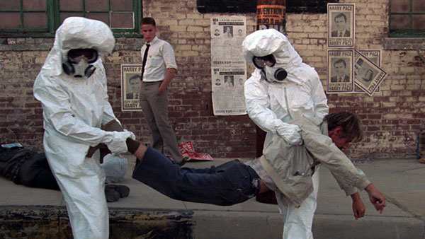 During the shoot-out, the camera pauses with exaggerated malevolence as each character takes a turn shooting the next; a stray bullet explodes a bottle of catsup, highlighting the Hollywood essence of the scene. Cox abuses military advertisement slogans. Scientology is zapped. Happy faces and generic brands lurk everywhere. Many of the characters get their names–Bud, Lite, Miller–from beer brands; this is further testimony to the commercial colonization of the human mind.