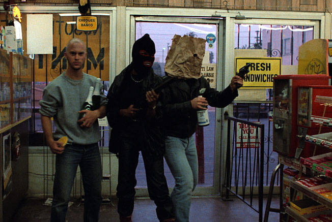 Little escapes Cox’s satiric bite. Hollywood itself is lambasted. Miller sneers, “John Wayne was a fag. I installed two- way mirrors in his pad in Brentwood. He came to the door in a dress.” When Bud faces off against the government agents, parodying gangster films, he shouts, “Come on copper! I’d rather die on my feet than live on my knees.” And when Duke gets shot in the convenience store (right after proposing to Debby that they settle down like everyone else–“I want you to have my baby”), he expires with a fusillade of Hollywood cliches: “The lights are growing dim. I know a life of crime led me to this . . . I blame society. Society made me what I am.” Otto says, “Bullshit. You’re a white suburban punk.” Duke replies, “It still hurts.”