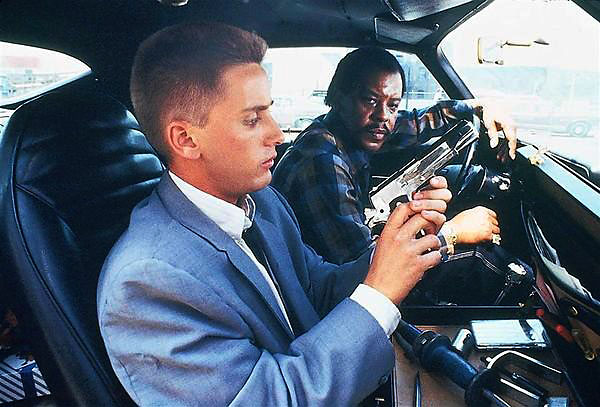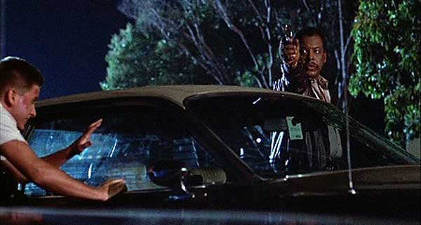 When Otto, trying to be cool and debonair, attempts to pick up Leila as she runs along the street, he runs into a pile of trash with a repossessed Cadillac. When Otto and Lite, the black repo man, find wrapped presents in a car, they toss them out the window at high speed. As a box bursts, revealing bundles of cash, Lite tells Otto to read the book, Dioretix: Science of Matter Over Mind because he once found a copy in a Maserati in Beverly Hills–hinting that the book leads to personal wealth. “Dioretix” is a gibe at Dianetics and a pun on diuretics–which increase the flow of urine. Bull’s-eye.